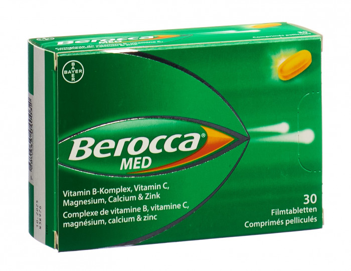 Berocca MED contains all water-soluble vitamins, i.e. the eight vitamins of the B group and vitamin C plus calcium, magnesium and zinc. These active ingredients are significantly involved in the structure and function of nerve cells (vitamins of the B group), support the body in its defence against infections (vitamin C, zinc), are important building materials for bones and teeth (calcium), ensure the transmission of nerve impulses (vitamin C, magnesium and zinc) and provide the body with the necessary nutrients.they are important building materials for bones and teeth (calcium), ensure the transmission of nerve impulses to the muscles, regulate muscle activity and are essential for the provision of muscle energy (magnesium and calcium). The body's metabolism is increased under increased physical or nervous stress. This increases the need for certain vitamins and minerals, such as vitamins of the B group, vitamin C, calcium, magnesium and zinc.