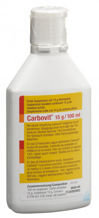 One bottle of Carbovit contains 15g of medicinal charcoal, which binds toxins and thus prevents them from being absorbed by the body. Carbovit is used for acute oral poisoning or drug overdoses.