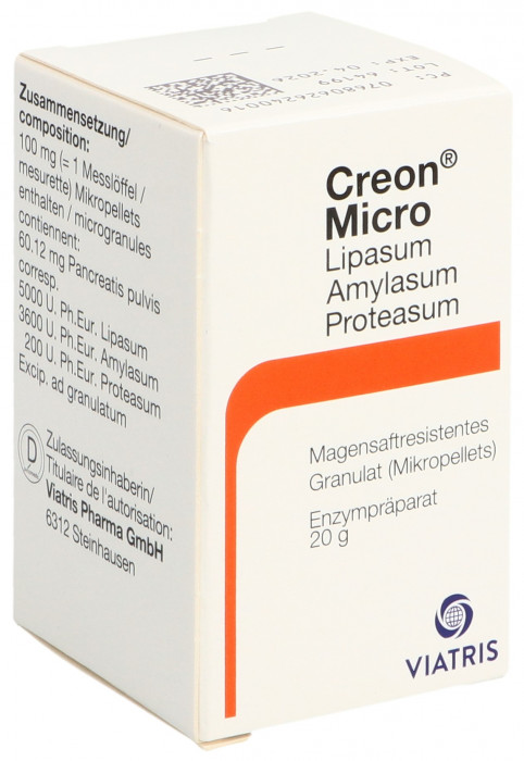 On the advice of a doctor, pharmacist or chemist, Creon Micro is used to treat or supplement inadequate pancreatic function, i.e, in the event of a deficiency or absence of digestive enzymes, e.g. following acute pancreatitis at the start of reintroduction of food or artificial nutrition, chronic pancreatitis, cystic pancreatic fibrosis or following surgical interventions in the digestive tract.