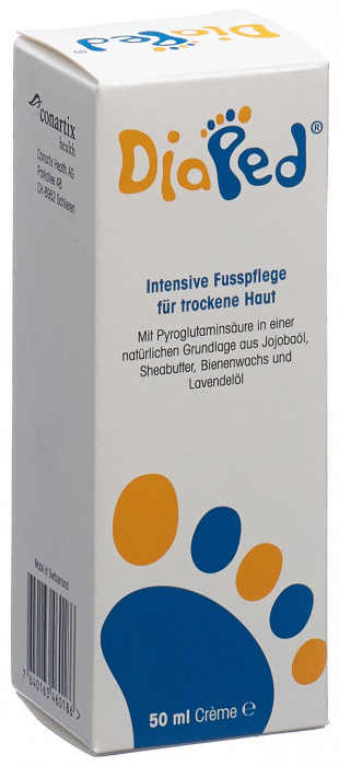 DiaPed foot cream is an intensively nourishing cream for the daily care of very dry, cracked, heavily stressed and particularly sensitive feet. DiaPed contains pyroglutamic acid in a natural base of jojoba oil, shea butter, beeswax and lavender oil. WITHOUT parabens. In humans, pyroglutamic acid is part of the skin's own natural moisturising factor (Natural Moisturising Factor, NMF). It helps the skin to retain moisture. Pyroglutamic acid is one of the most effective moisturising substances. Another important ingredient is shea butter. Shea butter contains allantoin, which nourishes the skin and promotes wound healing. Shea butter is therefore a particularly good ingredient when it comes to caring for very dry and cracked skin. Jojoba oil is not actually an oil, but a wax that is particularly rich in tannins. Tannins have an astringent effect. They help to reduce sweat production and close small cracks.