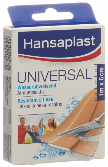 Hansaplast Universal plasters are water-repellent and breathable. They reliably protect the wound from dirt and bacteria and cushion it with a non-sticky wound dressing.