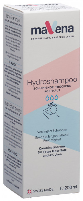 The mild Mavena Hydroshampoo gently cleanses dry & flaky scalps without drying them out. - Gently cleanses and soothes the scalp - Reduces dandruff - Provides long-lasting moisture thanks to high-magnesium Dead Sea salt - Combination of 5% Dead Sea salt and 4% urea Thanks to its mild formula, it is also suitable as an accompanying treatment for psoriasis/sporiasis on the head.