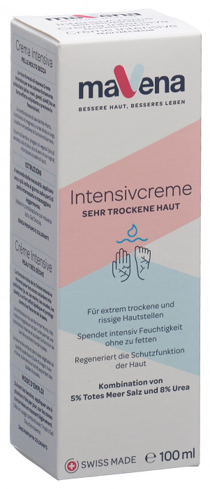 The rich Mavena intensive cream for heavily stressed skin areas (e.g. hands, elbows, feet) has a strong moisturising effect and protects against skin cracks. - Has a strong moisturising effect & prevents skin cracks in dry skin - Intensively moisturises with 8% urea (non-greasy) - Regenerates the skin's protective function with high-magnesium salt from the Dead Sea - Combination of 5% Dead Sea salt and 8% urea
