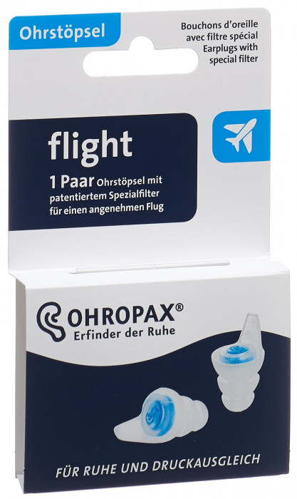 Earplugs with special filter for rest and pressure equalisation during a flight. Reusable.