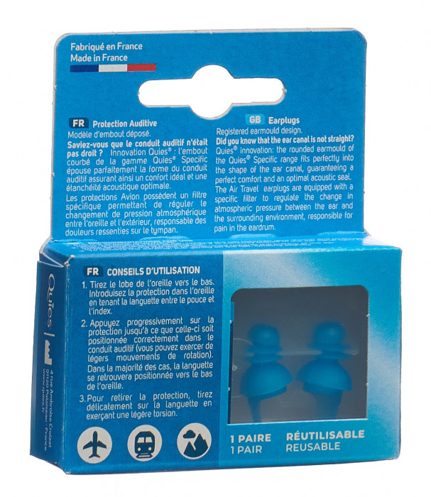 The curved earplugs in the Quies® Specific series mould perfectly to the shape of the ear canal, ensuring ideal comfort and an optimal acoustic seal. The aeroplane protection has a special filter that regulates the air pressure exchange between the ear and the outside world, which is responsible for the pain on the eardrum.
