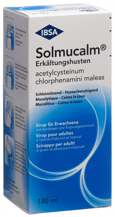Solmucalm Cold Cough is a cough syrup with two active ingredients: N-acetylcysteine, an expectorant that dilutes the viscous secretions so that they are easier to cough up, and chlorphenamine, a substance with a calming effect that also alleviates allergic symptoms.