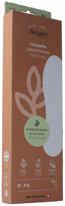 Do you want protection from unpleasant odours in every situation? SWISSPERS fresh soles are your daily companion and are "at your feet". Thanks to their thin design, they fit into any shoe so that you can move freely and relaxed. The fresh insoles have a vitalising and odour-inhibiting effect and keep the inside of your shoes pleasantly dry and super fresh.