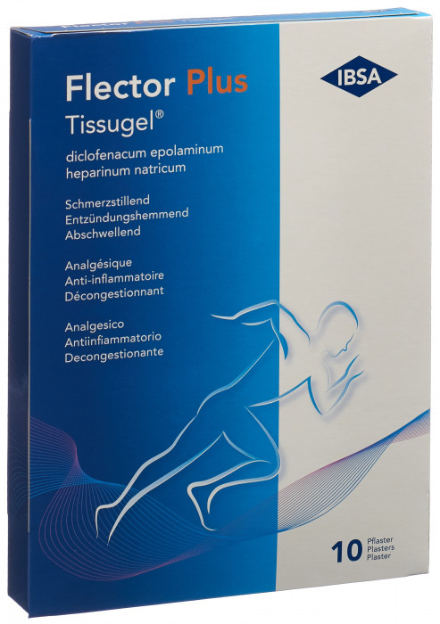 Flector Plus Tissugel ist ein selbsthaftendes, flexibles wirkstoffhaltiges Pflaster zum Auflegen auf die Haut, das als Wirksubstanzen Diclofenac und Heparin enthält. Lokal angewendetes Heparin fördert den Rückgang von Blutergüssen und Schwellungen. Diclofenac hat entzündungshemmende, abschwellende und schmerzstillende Eigenschaften.