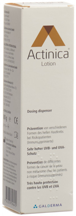 Actinica Lotion ganzjährig jeden Morgen auf die lichtexponierten Hautpartien reichlich auftragen. Dosierung gemäss Packungsbeilage. Geringere Auftragsmengen reduzieren die Schutzleistung. Auch Lichtschutzmittel mit hohen Lichtschutzfaktoren bieten keinen vollständigen Schutz vor UV-Strahlen. Direkten Sonnenkontakt und intensive Mittagssonne meiden. Schützende Kleidung tragen. Kann zu Verfärbungen von Textilien und anderen Materialien führen. Weitere Informationen siehe Gebrauchsanweisung.