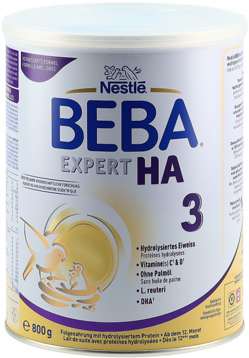 BEBA Expert HA 3, Folgemilch mit hydrolysiertem Protein, ab dem 12. Monat, 800g: BEBA HA, unsere patentierte Formel mit schonend hydrolysiertem Protein, beruht auf unserer langjährigen Erfahrung in der Proteinforschung. Die Folgemilch BEBA HA 3 eignet sich dabei für Säuglinge ab dem 12. Monat als Teil einer gemischten Kost, auch in Ergänzung zum Stillen. Zu den Besonderheiten der Formel zählen unter anderem ihr hydrolysiertes Eiweiss (schonend aufgespaltenes Protein) sowie L. reuteri (DSM 17938, exklusiv unter der Lizenz von BioGaia AB eingesetzt). Ausserdem enthält BEBA HA 3 die Vitamine C & D, welche zu einer normalen Funktion des Immunsystems beitragen, und Vitamin D, welches für ein gesundes Wachstum und eine gesunde Entwicklung der Knochen bei Kindern benötigt wird. Ohne Palmöl.