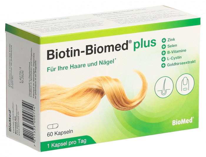 Biotin-Biomed® plus enthält eine wertvolle Kombination von Inhaltsstoffen für eine optimale Nährstoffversorgung der Haarwurzeln und der Nägel. Biotin, Zink und Selen tragen zur Erhaltung normaler Haare bei. Zudem tragen Zink und Selen zur Erhaltung normaler Nägel bei.