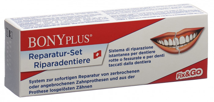 Kit, um selbst eine zerbrochene oder gerissene Zahnprothese zu reparieren und/oder einen Zahn an der Zahnprothese zu befestigen. Verwendung nur in Notfall.