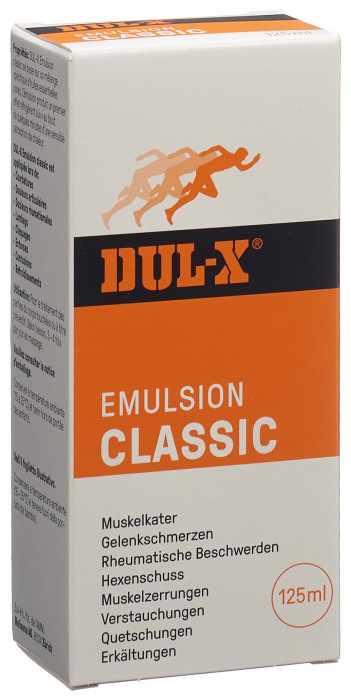 DUL-X Emulsion classic ist ein Einreibemittel zur Förderung der Hautdurchblutung auf Basis pflanzlicher ätherischer Öle. Das Charakteristische an DUL-X Emulsion classic ist ein primärer Kühleffekt, der nach wenigen Minuten durch ein deutliches Wärmegefühl abgelöst wird.
