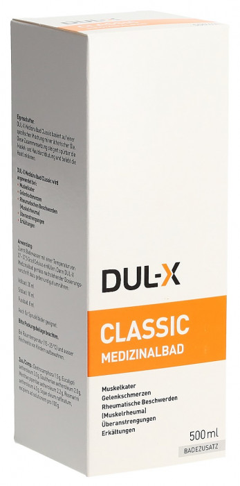 DUL-X Medizinalbad classic enthält ätherische Öle aus Pflanzen als Wirkstoffe. Es dient zur Entspannung und Schmerzlinderung bei Überanstrengungen des Bewegungsapparates (Muskeln, Gelenke).