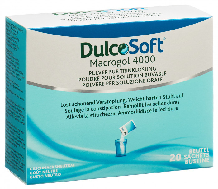 Das Dulcosoft Macrogol 4000 Pulver löst sanft Verstopfungen und weicht harten Stuhl auf. Die Trinklösung funktioniert ähnlich wie ein Schwamm, das getrunkene Wasser wird aufgenommen und gezielt in den Darm transportiert. Dadurch wird der Stuhl aufgeweicht und gewinnt an Volumen. Das Pulver ist geschmacksneutral und kann mit einem Getränk nach Wahl verdünnt werden. Für einen weichen Stuhl nach zirka 24-72 Stunden.