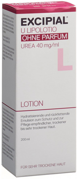 Excipial U Lipolotio, Emulsion zur Anwendung auf der Haut enthält ebenfalls den Wirkstoff Harnstoff in höherer Konzentration und in einer stärker fettenden Wasser-in-Öl-Emulsion. Sie ist wasserfest und zieht trotz hohem Fettanteil rasch ein. . Excipial U Lipolotio und Excipial U Lipolotio Sensitive unterscheiden sich darin, dass Excipial U Lipolotio ein Duftstoff enthält.