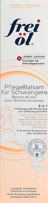 Der innovative frei öl® PflegeBalsam für Schwangere unterstützt die Vorbeugung und Minderung von Dehnungsstreifen. Seine ausgesuchten pflegenden Inhaltsstoffe nähren und glätten die Haut. Er lindert Juckreiz, Spannungsgefühle und Trockenheit und spendet wertvolle Feuchtigkeit. Die Haut bleibt so wunderbar elastisch und kann sich gut dehnen, während das Baby wächst. Die Formel besteht zu 94 % aus Inhaltsstoffen natürlichen Ursprungs.