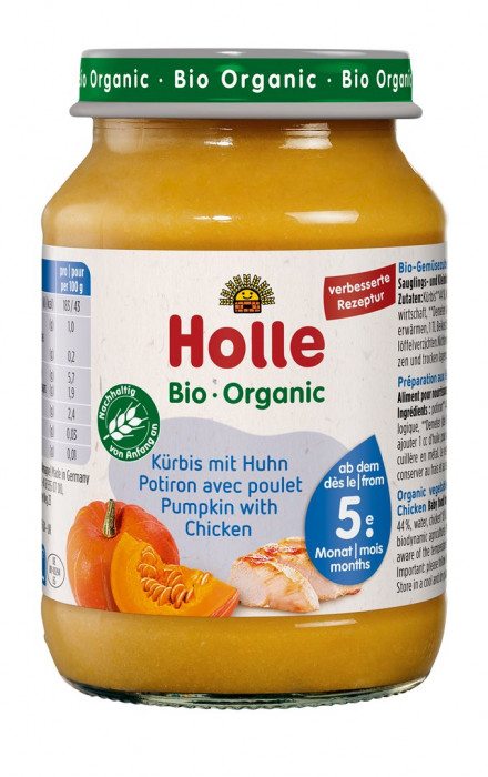 Kürbis** 44 %, Wasser, Hühnerfleisch* 8 %, Reisgrieß*. *aus biologischer Landwirtschaft,**Demeter (aus biodynamischer Landwirtschaft). DE.