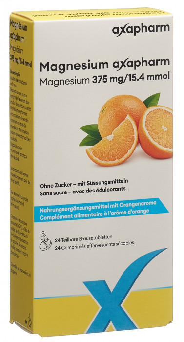 Magnesium Axapharm ist ein Nahrungsergänzungsmittel. Es enthält 375 mg Magnesium (entspricht 15.4 mmol) in Form von organischem Magnesiumcitrat, welches gut vom Körper aufgenommen wird. 375 mg Magnesium entsprechen 100% der empfohlenen Tagesdosis. Magnesium Axapharm ist als teilbare Brausetablette mit erfrischendem Orangengeschmack erhältlich.