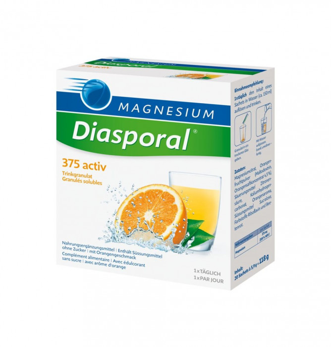 Schnell lösliches Trinkgranulat mit hochdosiertem Magnesiumcitrat, wie es als lebenswichtiger Bestandteil im Körper vorkommt. Das Magnesium-Diasporal activ Trinkgranulat enthält 375 mg Magnesium.