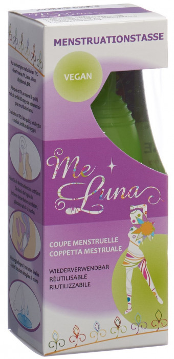 Die Me Luna® Mentruationstasse wird seit 2009 in Deutschland hergestellt. Unter Berücksichtigung der Bedürfnisse der Kundinnen findet eine ständige Weiterentwicklung statt. Sie ist erhältlich in acht Größen und drei Weichheitsgraden.