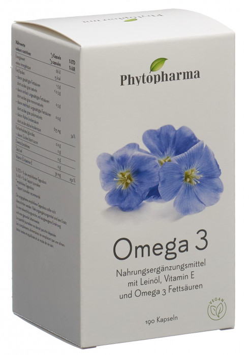 Jede Kapsel Phytopharma Omega 3 enthält 500 mg kaltgepresstes Leinöl. Leinöl enthält essentielle, ungesättigte Fettsäuren. Diese können durch den Körper nicht selbst hergestellt werden. Vitamin E ist notwendig für die Erhaltung der Muskelfunktion. Es stabilisiert ungesättigte Fettsäuren und Zellmembrane.