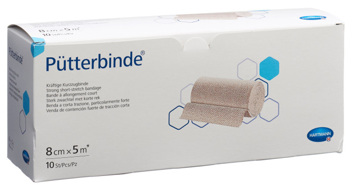 Das kräftige, textilelastische Gewebe der Pütterbinde erzeugt eine sehr starke Kompression mit hohem Arbeitsdruck bei entsprechend niedrigerem Ruhedruck. Der Einfluss auf die Entstauung ist sehr groß, da er auch die tiefen Venen erreicht. Die Pütterbinde besteht zu 100 % aus reiner Baumwolle und gilt deshalb als besonders hautfreundlich. Sie ist geeignet für eine sehr starke Kompression bei aktuen und chronischen venösen Stauungsödemen, die ein häufiges Neuanlegen der Binden notwendig machen. Die Pütterbinde besteht aus 100 % Baumwolle. Sie ist atmungsaktiv und hautverträglich sowie kochfest und sterilisierbar (Dampf A 134°C). Dehnbarkeit ca. 90 %.