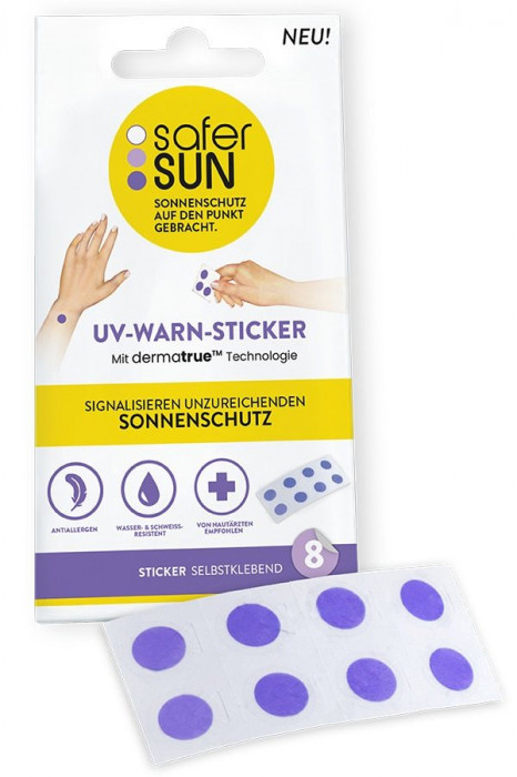 Der Sonnenschutz verliert mit der Zeit seine Wirkung. Ob Sie noch geschützt sind, war bisher nicht feststellbar. Um dieses Problem zu lösen, wurde der intelligente safer SUN UV-WARN-STICKER entwickelt. Er misst genau jene Strahlung, die aktuell auf Ihre Haut durchdringt. Ist der Schutz ungenügend, so wechselt der Aufkleber seine Farbe von transparent auf violett.