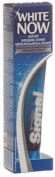 Die Signal White Now Zahnpasta funktioniert mit blauem Schaum, der die Zähne bereits nach nur einmal putzen weisser scheinen lässt. Gleichzeitig helfen spezielle Inhaltsstoffe, das natürliche Weiss der Zähne zurückzugewinnen. Ausserdem liefert sie den Schutz einer regulären, fluoridhaltigen Zahnpasta, wodurch sie bestens geeignet ist für den täglichen Gebrauch. Der gletscherfrische Geschmack sorgt zudem für ein angenehm frisches Mundgefühl.