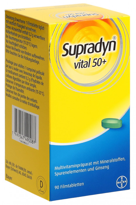 Supradyn Vital 50+ enthält die wichtigsten Vitamine, essentiellen Mineralien und Spurenelemente sowie Ginseng in ausgewogenen Mengen für Erwachsene im Alter von über 50 Jahren. Vitamine und Mineralien sind lebensnotwendige Substanzen, die dem Organismus mit der Nahrung zugeführt werden.