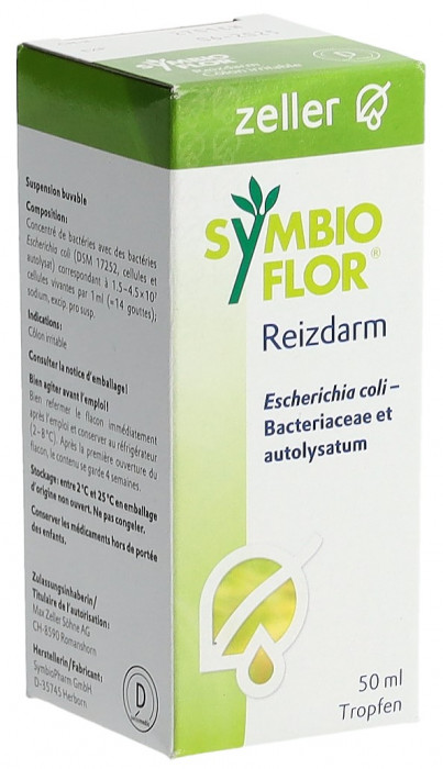 Produktinformationen Anwendungsgebiet SYMBIOFLOR® Reizdarm dient zur Behandlung von: Reizdarm (Colon irritabile) - Mikrobiotische Unterstützung - Steigert die körpereigene Abwehr - Für Erwachsene und Kinder Dosierung / Anwendung / Packung Erwachsene ab 18 Jahren: Zu Beginn der Behandlung 3 Mal täglich 10 Tropfen Nach einer Woche auf 3 Mal täglich 20 Tropfen steigern Kinder: 1 Mal täglich 10 Tropfen Die Tropfen in etwas Wasser gelöst zu den Mahlzeiten einnehmen. Kinder nehmen sie zur Mittagsmahlzeit. Präparat vor Gebrauch gut schütteln. Packungsgrössen: 50 ml Wirkstoffe 1 ml (= 14 Tropfen) enthält als Wirkstoff: Bakterienkonzentrat mit Escherichia coli-Bakterien (DSM 17252), entsprechend 1.5 – 4.5 × 10 hoch 7 lebende Zellen