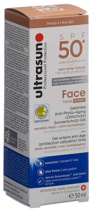 Das getönte Ultrasun Face SPF30 Sonnenschutz Creme-Gel mit Ectoin® und seiner patentierten lamellaren Struktur bietet einen sehr hohen Schutz vor der Sonne, eine intensive Feuchtigkeitspflege und verleiht einen gleichmässigen Hautton dank natürlichen Farbpigmenten. Die Farbpigmente passen sich dem eigenen Hautbild an, so dass das Ergebnis sehr natürlich wirkt. Das getönte Face Creme-Gel beugt sonnenbedingter vorzeitiger Hautalterung vor und ist für die tägliche Anwendung geeignet - auch für empfindliche Haut.