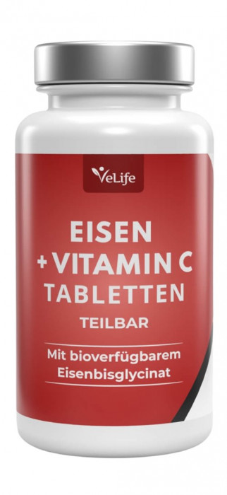 Die teilbaren Eisenbisglycinat-Tabletten von Velife mit Vitamin C (Markenrohstoff PureWay-C™) bieten eine effektive Kombination aus 20 mg Eisen und 50 mg Vitamin C pro Tablette. Das verwendete Eisenbisglycinat ist eine sehr gut verträgliche Eisenform, die als schonender für den Magen gilt und eine hohe Bioverfügbarkeit aufweist. PureWay-C™ ist eine patentierte Form von Vitamin C, die für ihre besonders gute Aufnahme bekannt ist. In Kombination mit Eisenbisglycinat trägt sie zur optimalen Eisenverwertung im Körper bei.