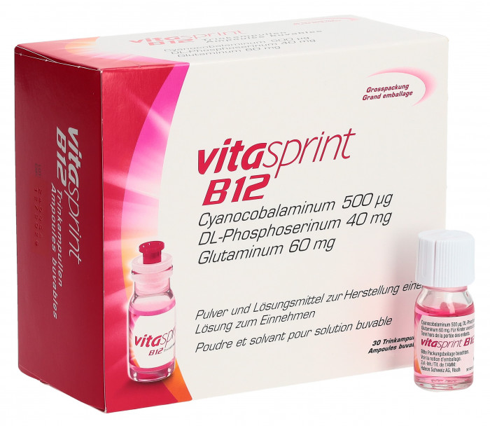 Vitasprint B12 ist ein Aufbaupräparat mit den drei Wirkstoffen Vitamin B12 (500 µg) und den beiden Aminosäuren Phosphoserin (40 mg) und Glutamin (60 mg).