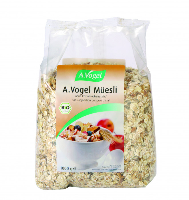 A. Vogel Müesli wird aus kontrolliert biologisch angebauten Vollkorngetreide hergestellt. Weizen-*, Hafer-*, Roggenflocken*, Rosinen*, Gerstenflocken*, geröstete Naturreisflocken*, Apfelstücke* 5%, Mandeln*. *Aus kontrolliert biologischem Anbau..