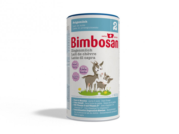Bimbosan follow-on milk, without palm oil, protein exclusively from high-quality goat's milk.