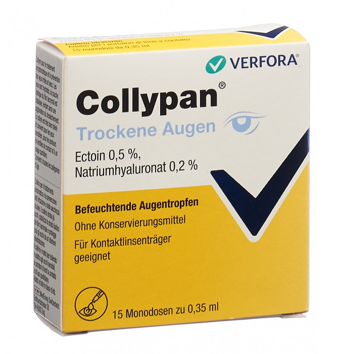 Collypan Dry Eyes are eye drops that are used for the symptomatic treatment and prevention of irritated and dry eyes. The eyes are moisturised, the lipid layer of the tear film is stabilised and thus protected from further drying out. Dry eyes can be caused by mechanical stress (e.g. wearing contact lenses), environmental stress (e.g. air conditioning), visual stress (e.g. screen work) or as a side effect of medication. The eye drops contain ectoine and sodium hyaluronate (hyaluronic acid in the form of its sodium salt). Ectoin is a natural cell protection molecule with anti-inflammatory and tear film stabilising properties. Sodium hyaluronate, also a natural substance, is found in the structures of the human eye as well as in the tear film and forms a moisturising film on the surface of the eye.