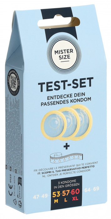 Measuring tape and instructions for discovering your condom size 3 MISTER SIZE condoms in sizes 53, 57 & 60 perfect for finding out your exact size ideal fit intensive feel transparent & smooth - extra moist recommended for a circumference of 10.5 cm - 14.5 cm