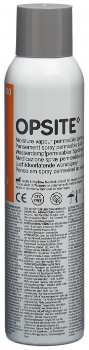 The transparent spray dressing Opsite Spray protects dry surgical sutures and superficial wounds.