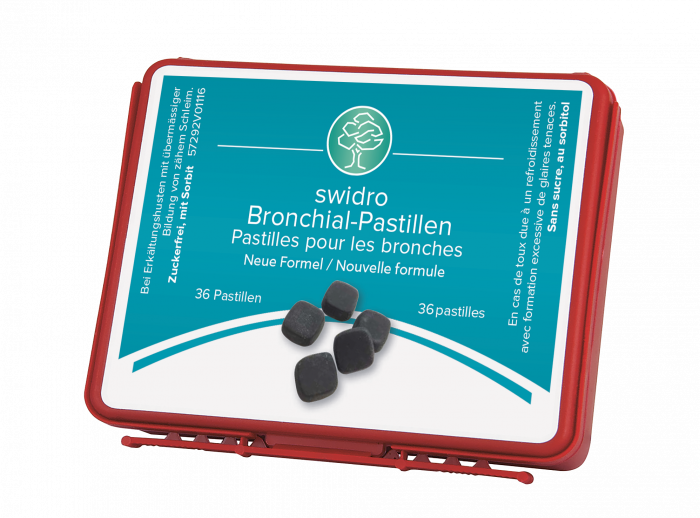 In addition to two essential oils and menthol, Swidro Bronchial Pastilles N also contain plant extracts that promote expectoration, in particular liquorice root juice, as active ingredients. Experience has shown that they are used to relieve cold coughs and throat catarrh with hoarseness and sore throats, especially with excessive formation of thick mucus.