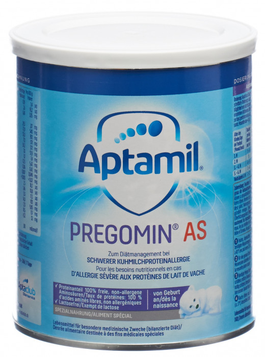 Aptamil Pregomin AS est adapté à la gestion du régime en cas d'allergie sévère aux protéines de lait de vache. Aptamil Pregomin AS peut être utilisé pour l'alimentation exclusive de votre bébé dès la naissance. Respectez scrupuleusement le mode d'emploi lors de la préparation d'Aptamil Pregomin AS. Une préparation et un stockage incorrects peuvent avoir des conséquences néfastes sur la santé en raison de la croissance de germes indésirables. Préparez les aliments frais avant chaque repas et nourrissez-les immédiatement. Ne pas réutiliser les restes de nourriture. Nettoyez soigneusement le biberon, la tétine et la bague. Ne réchauffez pas les aliments lactés au micro-ondes (risque de surchauffe).