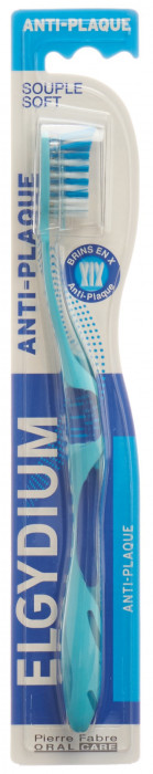ELGYDIUM Anti-Plaque est une brosse à dents avec des poils en X croisés pour une libération fiable de la plaque bactérienne sur les dents.