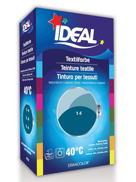 Teinture textile pour rafraîchir et teindre le coton, le lin, la jute et la viscose. La couleur résiste au lavage et la machine reste propre. Indépendamment de la dose de couleur, ajoutez toujours 500g de sel de cuisine par cycle de lavage. Grâce aux couleurs Ideal, vous pouvez recolorer vos vêtements, accessoires, linge de lit ou rafraîchir les couleurs.