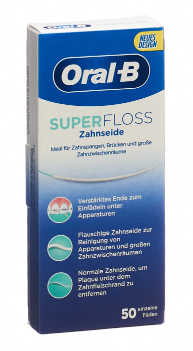 Oral-B Super Floss est idéal pour le nettoyage des appareils dentaires, des implants, des bridges et des espaces interdentaires plus importants. Ses trois composants uniques - un guide-fil dentaire avec un début renforcé, une partie centrale moelleuse et un fil dentaire normal - fonctionnent ensemble pour obtenir le meilleur résultat possible.