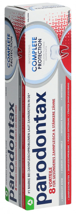 Parodantax Complete Protection White aide à obtenir une blancheur douce, tout en assurant une sensation de fraîcheur dans la bouche grâce à un nettoyage intensif et en luttant contre la mauvaise haleine. Il contient du fluor pour renforcer l'émail des dents et aide à réduire et à prévenir les causes des problèmes de gencives et des saignements. Le dentifrice assure une élimination efficace des bactéries de la plaque dentaire et maintient la fermeté des gencives.