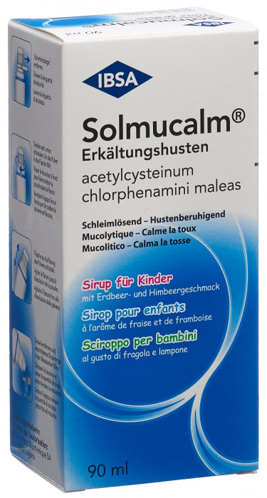 Solmucalm toux grasse est un sirop contre la toux contenant deux substances actives : N-acétylcystéine, un expectorant qui dilue les sécrétions visqueuses afin de les rendre plus faciles à expectorer, et chlorphénamine, une substance à l'effet calmant qui atténue en même temps les manifestations allergiques.