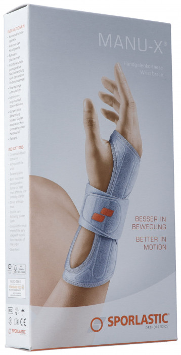 Le bandage de poignet Sporlastic Manu X, de couleur noire et de taille 2, convient aux poignets de plus de 17 cm de circonférence. Elle stabilise et protège le poignet tout en étant adaptable individuellement grâce à des attelles de renfort.