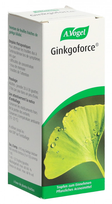 Ginkgoforce est un médicament à base de plantes et contient une teinture de feuilles fraîches de l'arbre du temple japonais(Ginkgo biloba L.). On attribue aux composants (entre autres les flavonoïdes du ginkgo) des propriétés favorisant la circulation sanguine. Ginkgoforce peut être utilisé pour soulager les troubles liés à l'artériosclérose, notamment les symptômes tels que l'oubli, les troubles de la concentration et de la mémoire.